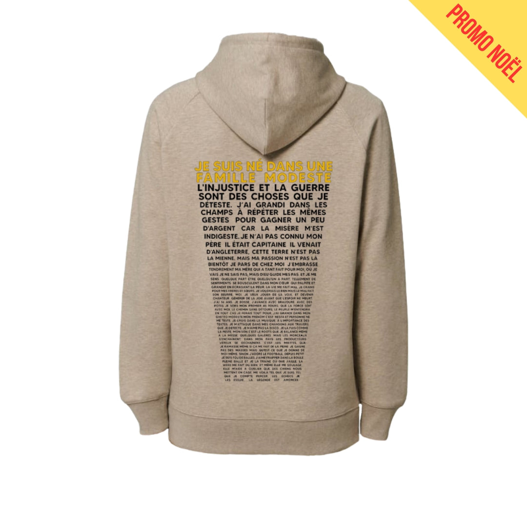 Sweat à capuche 80% coton / 20% polyester, sérigraphie réalisée en France avec des encres à l'eau (sans solvants) et biodégradables.
