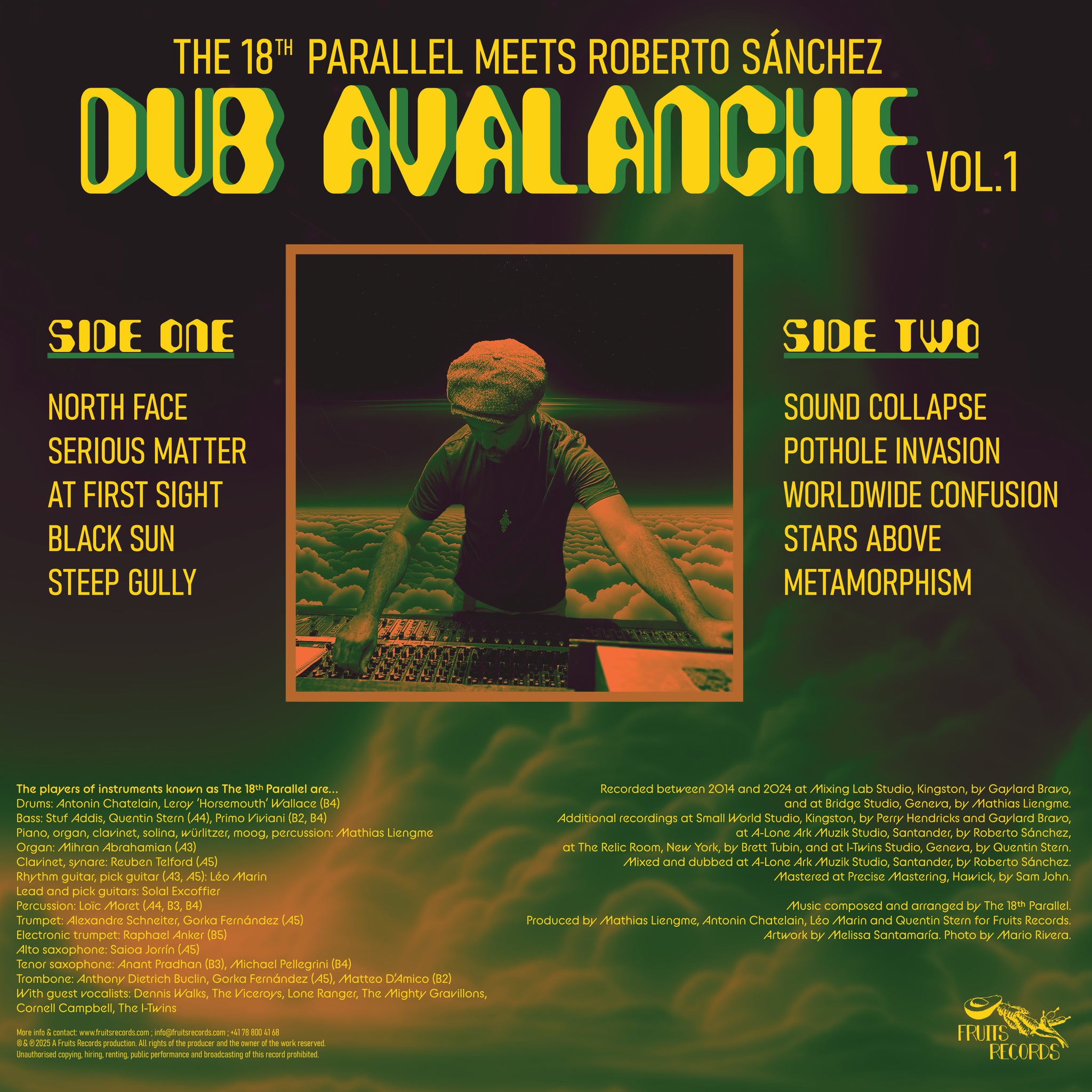 Fruits Records présente le premier volume d’une série d’albums dub par le collectif suisse The 18th Parallel. S’inscrivant dans la tradition des producteurs jamaïcains qui revisitaient leur catalogue en déclinaison dub — comme Bunny Lee et ses Aggrovators avec King Tubby, Junjo Lawes ou Linval Thompson avec les Roots Radics et Scientist, ou encore Joe Gibbs et ses Professionals avec Errol Thompson — Fruits Records lance DUB AVALANCHE, une série produite par le studio band du label, invitant différents ingénieurs du son à (re)mixer les titres au fil des disques.